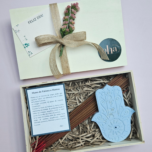 Kit Hamsa - Portainciensos concreto, inciensos, leyenda Hamsa, caja madera