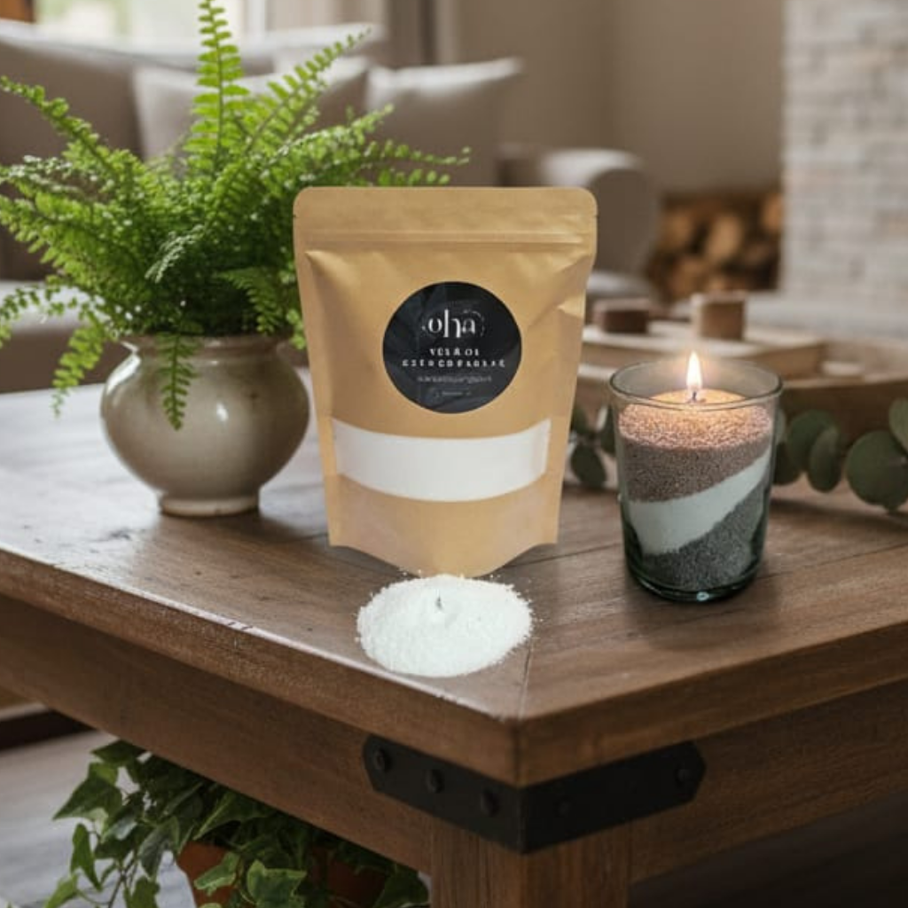 Vienen en bolsas de 300 gr cada una y te entregamos una cajita con 30 pabilos para que puedas utilizarlas muchas veces. (los envases de la foto no vienen incluidos)